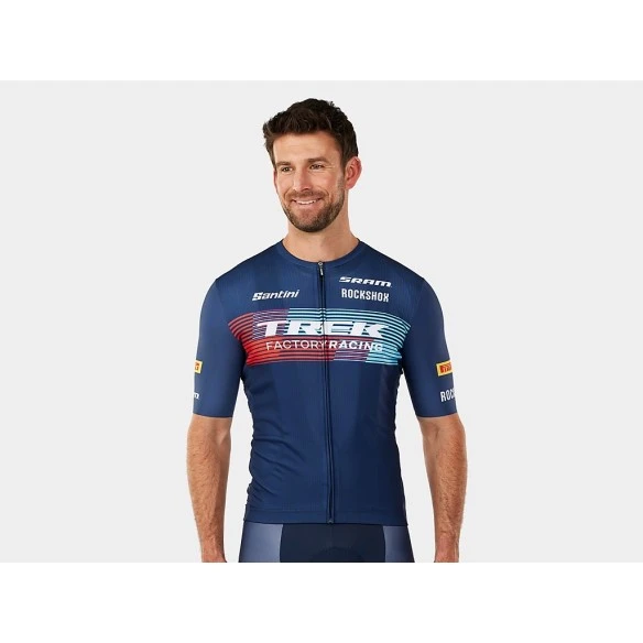 Vêtements officiels de l’équipe fabriqués par Santini avec le logo de l’équipe Trek Factory Racing fièrement affiché.